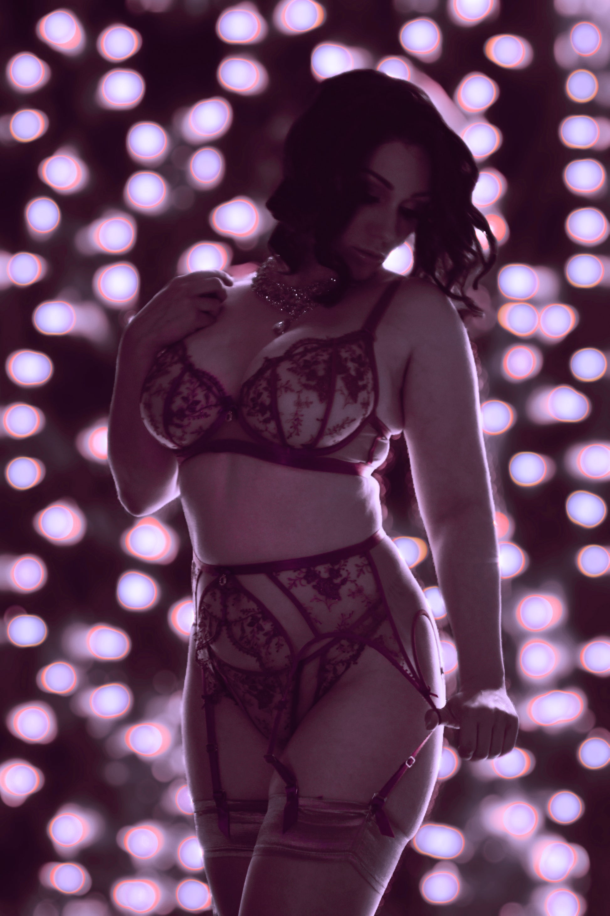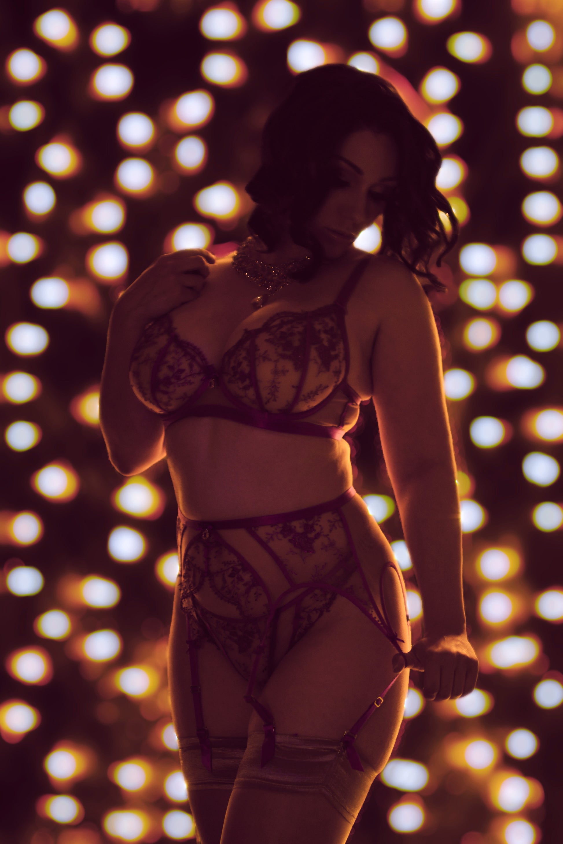 Under the enchanting glow of the starry night lighting, she adorned herself in glamorous lingerie, each delicate lace detail weaving a tale of allure. As the clock struck midnight, she embraced the year's end with confidence, wrapped in elegance of anticipation and the unknown ✨